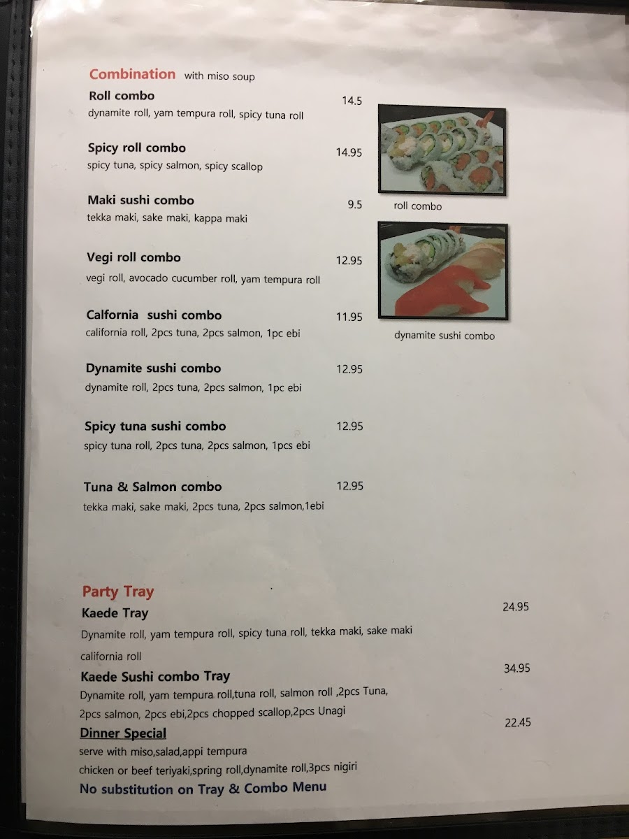 Kaede Sushi also features a variety of Combination platters such as the Roll Combo, Spicy Roll Combo, Maki Sushi Combo, and the California Sushi Combo, ideal for those wanting to sample a little bit of everything. Other offerings like the Spring Roll and Dynamite Sushi Combo provide a perfect balance of flavor and texture.